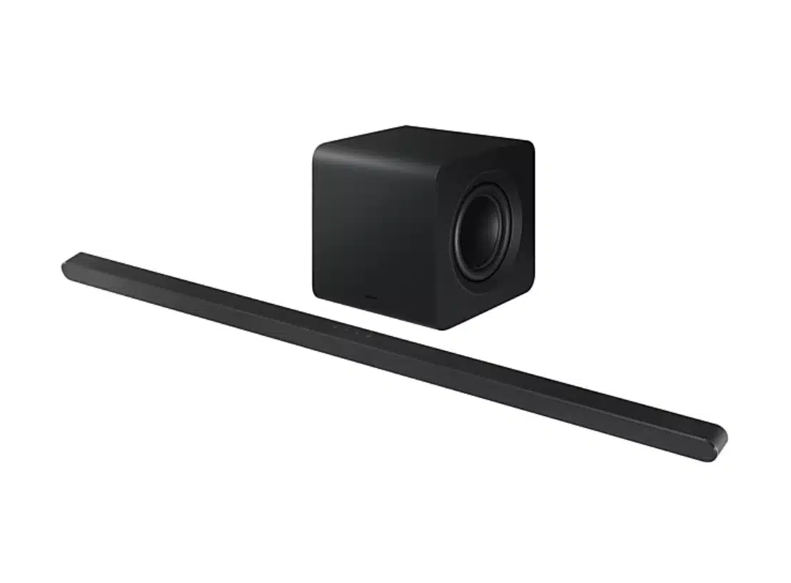 - Ultra-Slim Profile in Titan Black Finish: Minimalist design fits discreetly beneath TVs and complements modern décor—Samsung’s thinnest premium soundbar yet.